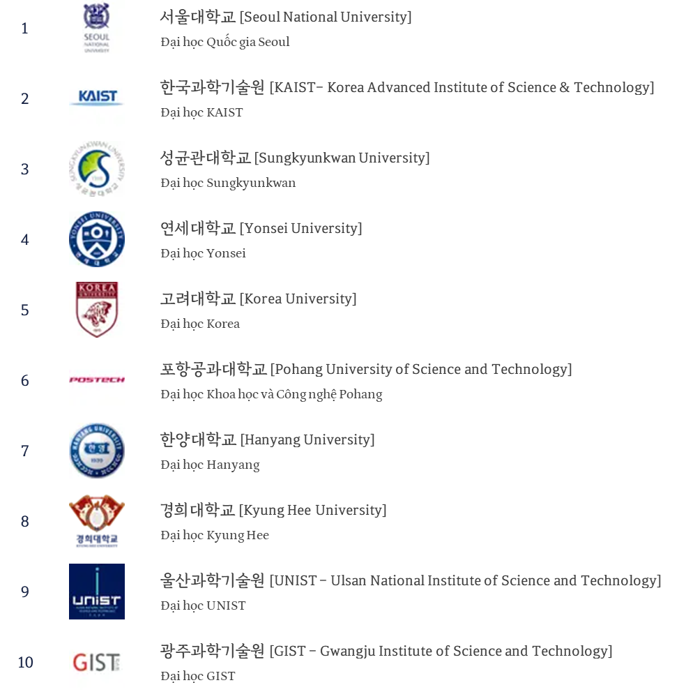 Đối với những ai muốn theo học chương trình học tập ở Hàn Quốc, bảng xếp hạng các trường đại học là một trong những dữ liệu thông tin cần thiết giúp bạn có thể đánh giá tổng quan về các trường đại học và để cân nhắc lựa chọn được trường phù hợp với bản thân mình.