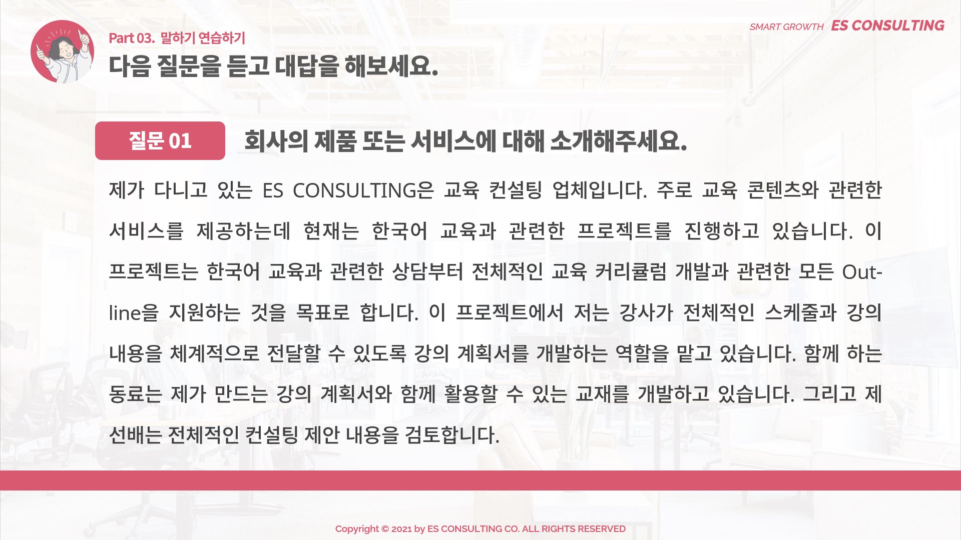 [Luyện nói tiếng Hàn theo chủ đề] Part. 04 Nơi làm việc (dành cho người đi làm) - ES CONSULTING